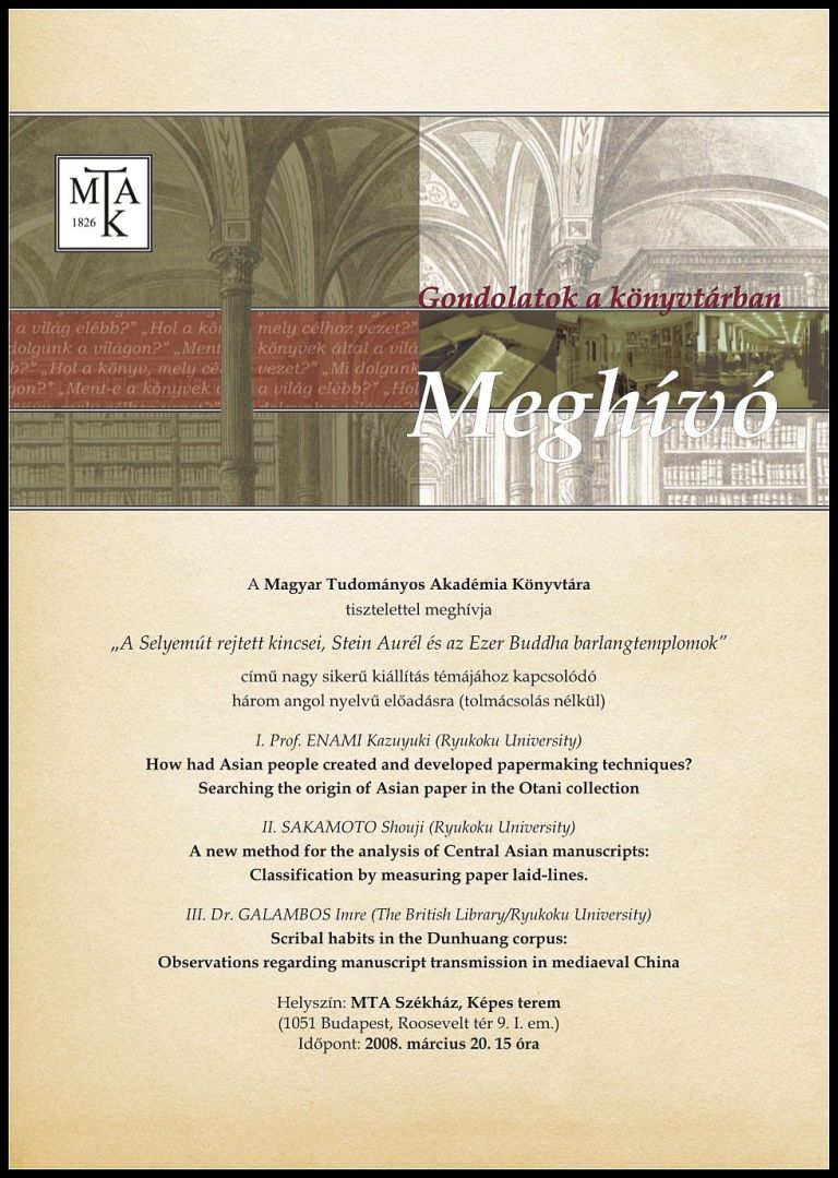 A Selyemút rejtett kincsei c. kiállításhoz kapcsolódóan – ld. a hongkongi hírt alább, illetve az oldal alján látható anyagot a Vasarely-teremben 2007 végén tartott kiállításról – angol nyelvű előadásokra kerül sor, amelyre az Akadémiai Könyvtár szeretettel várja az érdeklődőket.