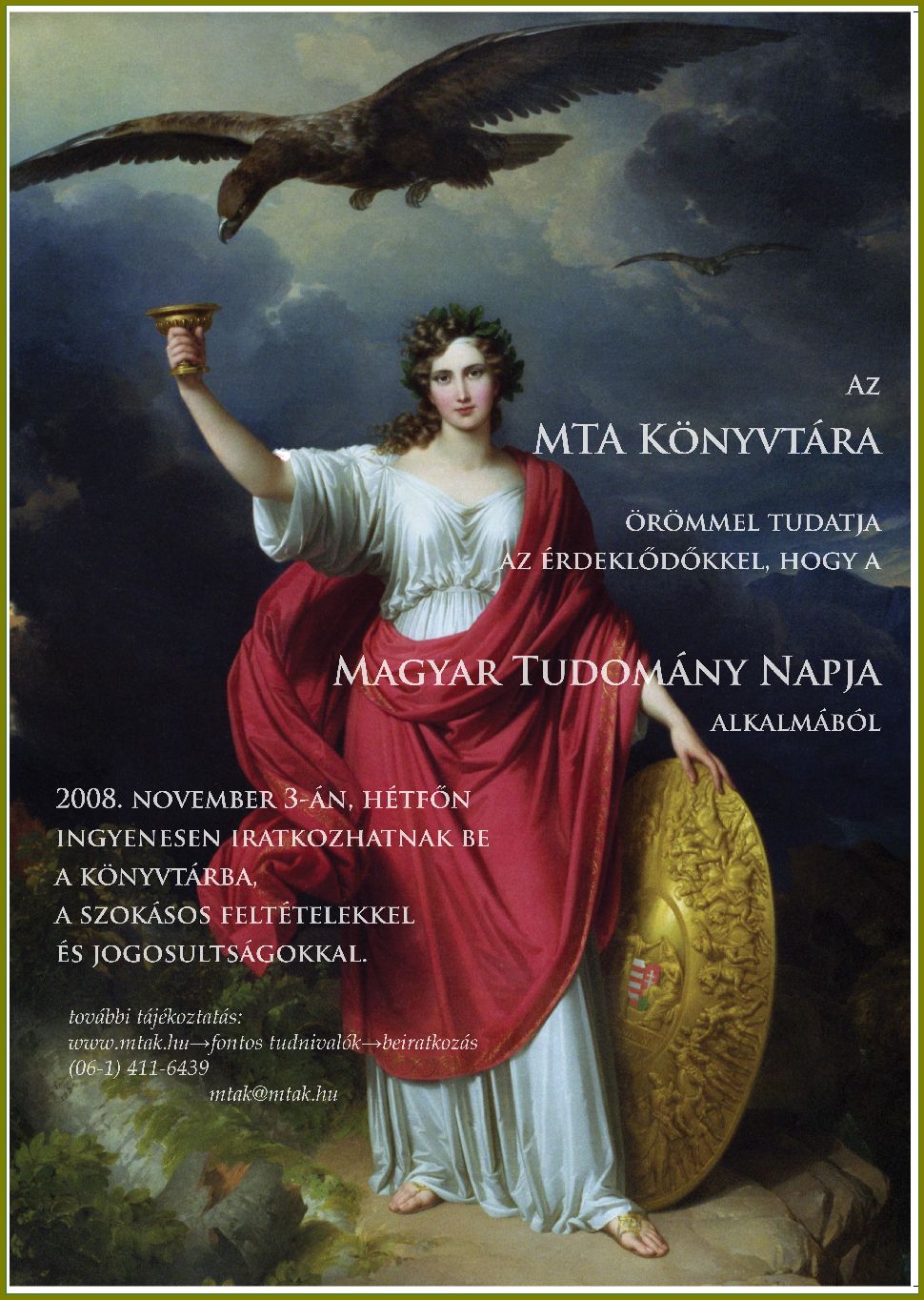 Az MTA Könyvtára örömmel tudatja az érdeklődőkkel, hogy a Magyar Tudomány Napja alkalmából 2008. november 3-án, hétfőn ingyenesen iratkozhatnak be a könyvtárba, a szokásos feltételekkel és jogosultságokkal.